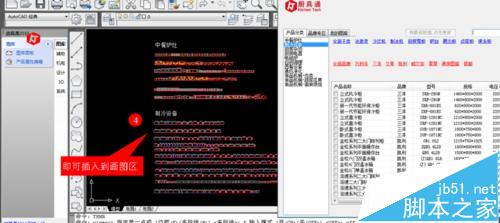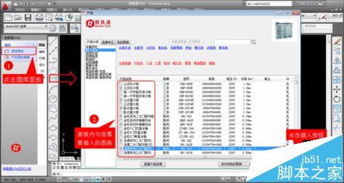 3、圖塊添加功能,首先點擊頁面左側的“圖庫”按鈕,然后點擊“圖庫面板”會出現包含各類圖庫的一個窗口。通過在方框中勾選選擇自己所需要的圖庫設備,然后按“插入”按鈕,就會回到制圖區,直接將圖塊放置在指定區域即可。
