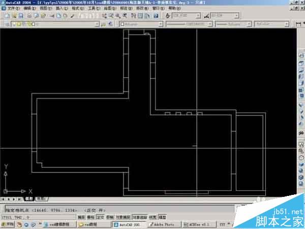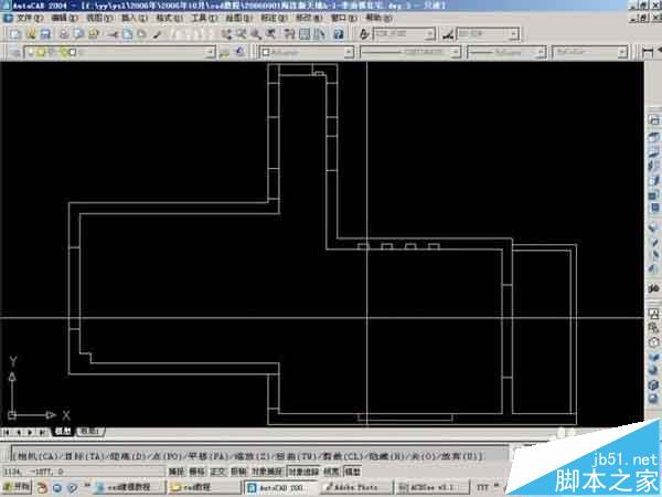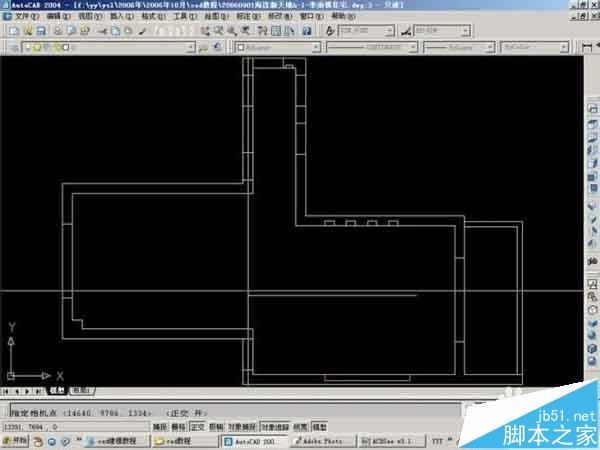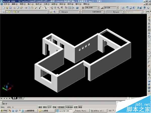 3、用多義線把要表現的區域(墻體)輪廓繪制好,扁移280[一個墻體厚],用ext命令拉伸2650[墻高], 再用su命令布爾運算就可得到墻體,用類似的方法做出門洞和墻面壁龕。把建好的墻體模放在1-墻體圖層中。