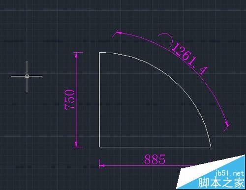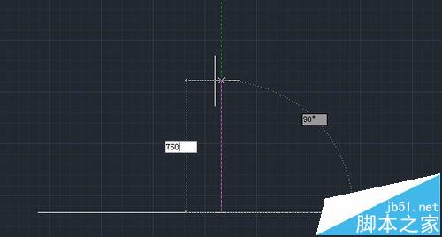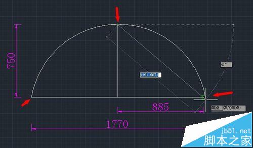 2、然后在操作界面畫線,如圖我們已知直角邊885和750,方法是按長885×2、高750來繪制三點定圓弧。先畫885×2=1770長的直線。鼠標盡量水平移動,系統會有一條綠色的虛線自動定位到水平或者垂直。(因為之前打開了極軸追蹤)