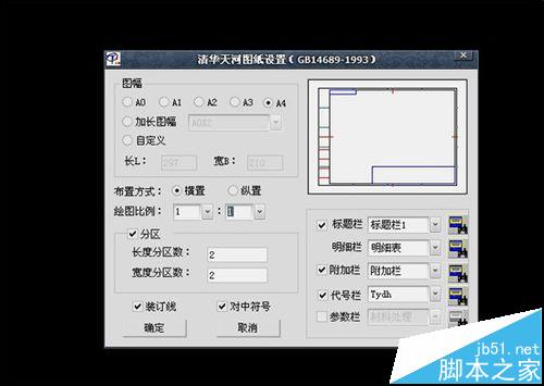 4、在“清華天河圖紙設(shè)置”窗口中我們可以看到有A0到A4五種圖幅,但在繪圖中我們可能遇到更大的尺寸的圖紙,可以對圖幅進(jìn)行相應(yīng)的比例設(shè)置。