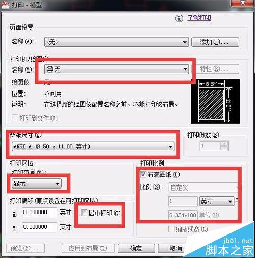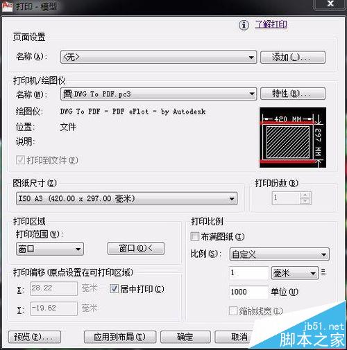 3、在打印設置中,打印機名稱、圖紙尺寸、打印范圍、打印比例、打印偏移(是否居中打印)都需要設置
