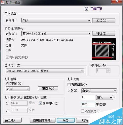 4、下圖為以打印A3大小PDF為例所做的設置。其中打印范圍選項需要選擇“窗口”,然后在cad圖紙中自行選擇需要打印的范圍,比例則根據圖紙、打印頁面的大小不同而自行設置。