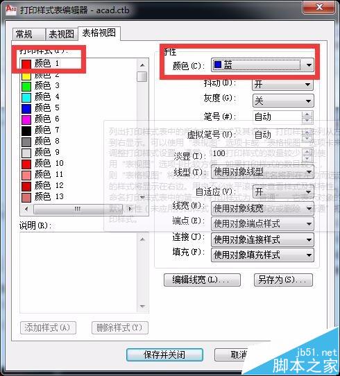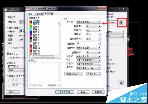 7、點擊右側的工具,就會出現打印樣式表編輯器了,在里面可以根據圖層的不同顏色來設置打印的顏色。