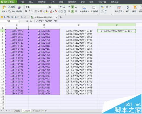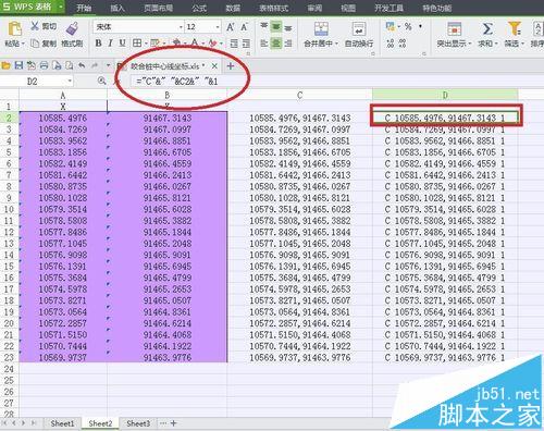 4、在Excel中另起一列輸入(="C"&" "&C2&" "&1)括號內(nèi)的內(nèi)容。其中C是CAD中畫圓的快捷鍵,上式C后跟一空格,在CAD中相當(dāng)于確定命令,接下來C2為圓心坐標(biāo),空格,半徑1。&符號在Excel中是連接符號。