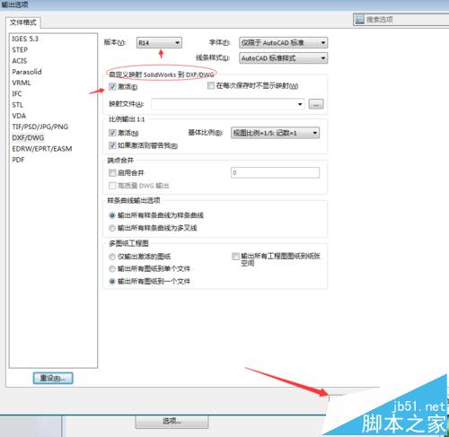 2、出現“輸出選項”對話框,設置文字映射文件為“ Solidworks to dwg.txt ”
