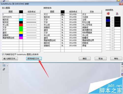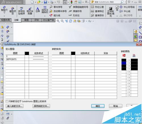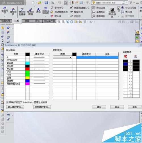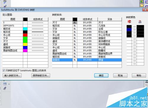 5、點擊“映射到實體,這是把你 Solidworks 工程圖中的各種“實體”應該放到 DWG 文件的哪各圖層的設置,點擊添加,把各實體分別放到第 4 步設定好的圖層上去。有很多,別弄昏了頭。