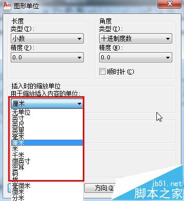 2、在cad插入是的縮放單位中可以選擇各種單位,然后點擊確定。