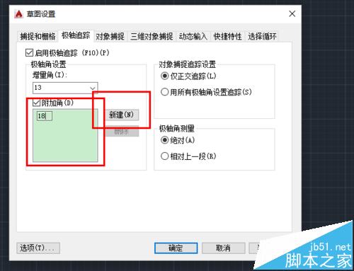 5、這樣設(shè)置雖然很精確捕捉到了13度,但是依然是遞增的,就是下一個(gè)被捕捉的是26度,假如在繪制時(shí)我想捕捉一個(gè)18度的,這里就無法捕捉到。解決方法是利用附加角。在增量角下面有一個(gè)附加角選項(xiàng),勾選一下,然后點(diǎn)擊新建,輸入18.回到界面,使用直線工具。