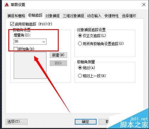 3、可以看出來,出現(xiàn)綠色虛線的時(shí)候,其角度都是30的倍數(shù),我們打開極軸追蹤的“正在追蹤設(shè)置”,找到增量角,發(fā)現(xiàn)這里的數(shù)字是30,也就是說按照30的增量遞增,30,60,90,120,150......都可以成功被捕捉到。