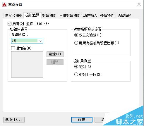 4、所以如果是常用的角度,類似30度,45度,60度,90度,180度這樣的就可以在極軸捕捉里面選擇一行數(shù)進(jìn)行捕捉。但是如果是不常用的,例如13度這樣的數(shù)字怎么辦呢?回到剛剛增量角那里,我們將增量角的數(shù)字改成13,再回到主界面進(jìn)行直線繪制。