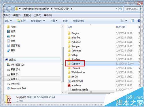 5、進入CAD2014安裝文件夾(你的版本也是一樣的),點擊“support”文件夾進入。