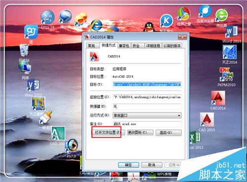4、進入到CAD2014的屬性界面,點擊左下方的“打開文件夾位置”,找到安裝文件夾。不建議慢慢去找,也許忘記了安裝在哪個磁盤,這個方式是最有效最快捷的。