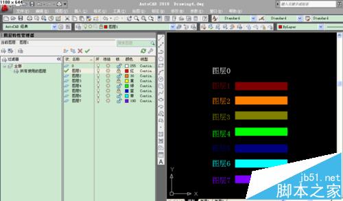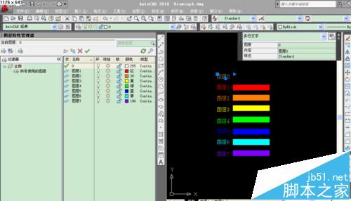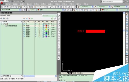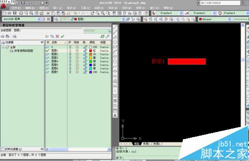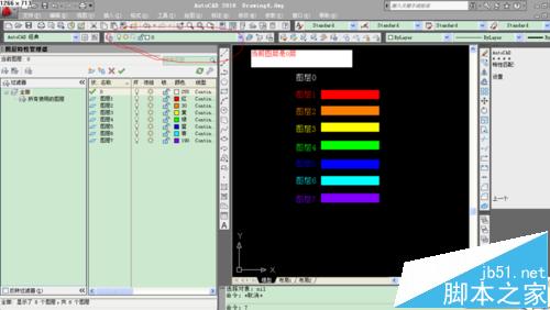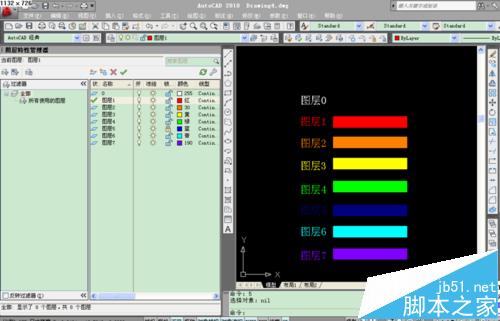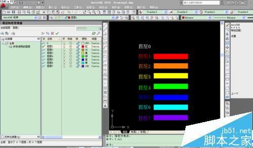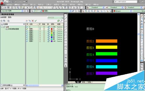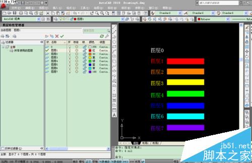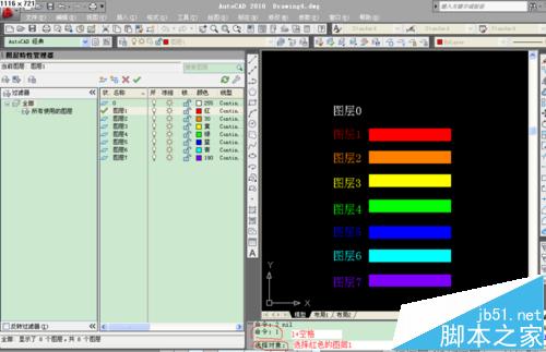 4、以上為插件加載過程,其他插件加載過程也是用這種方法。下面以一個簡單的實例來說明下圖層管理插件的使用,如圖所示:在cad中分別建立8個圖層,使用不同顏色來區(qū)分