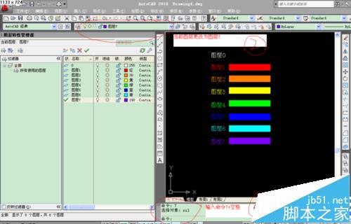 實際操作:在命令行輸入:7 敲下空格鍵 選擇紫色的圖層7,就會將圖層7設(shè)置為當前圖層,如圖所示