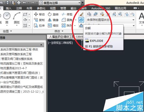 6、選中需要分解的對(duì)象,點(diǎn)擊上面的“分解”命令標(biāo)示,圖塊成功拆分。