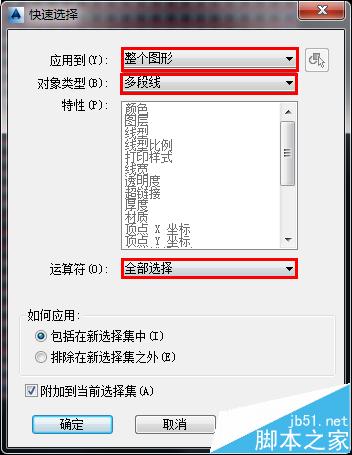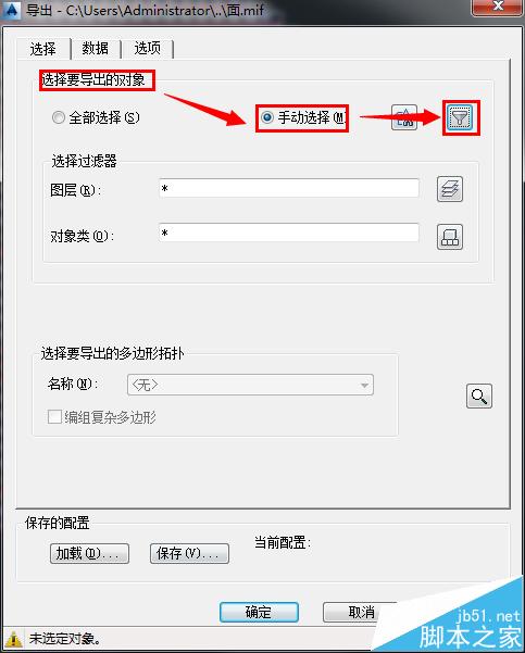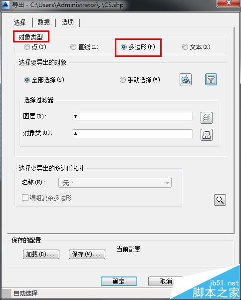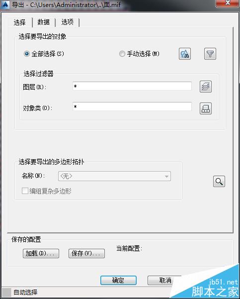 ,這里是導出的關鍵步驟。點擊“選擇”,進入“選擇”分頁在“選擇要導出的對象”一欄選擇“手動選擇”,點擊過濾符號 進入“快速選擇”界面,在“應用到”一欄選擇“整個圖形”,“對象類型”選擇“多段線”,“特性”不動,“運算符”選擇“全部選擇”,其余默認。