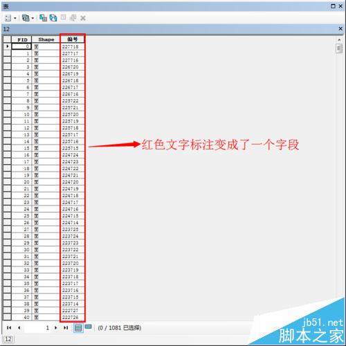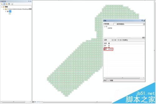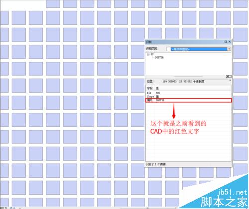 可以看到,之前的CAD線框被轉換成了ArcGIS的面,而且用識別工具點一下任意一個面可以識別出他的屬性,其中的“編號”一行就是CAD中的紅色文字(說明一下:這里看到的和之前的紅色文字不一樣,是因為在轉換的時候對文字進行了修改,后面會說到,如果不修改就是一樣的)。同時,如果我們打開圖層的屬性表,可以看到屬性表中有一行“編號”字段,存儲的就是CAD中的紅色文字。