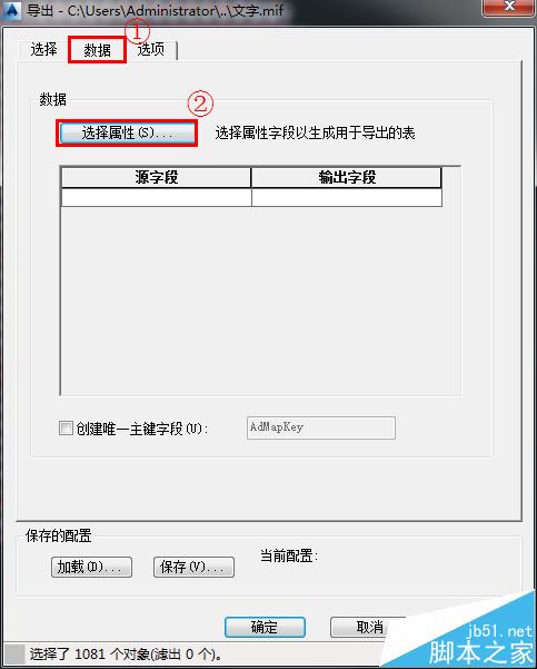 同樣的步驟,我們再將文字導出成mif格式的文件,將文件命名為“文字”。這里和導出多段線有點區別,首先是在圖9那里,“對象類型”要選擇“文字”;設置界面處,我們需要點擊“數據”分頁,點擊“選擇屬性”,在彈出的“選擇屬性”對話框中雙擊“特性”勾選上“字符串”,點擊“確定”回到“數據”分頁,再次點擊“確定”開始輸出文字的mif文件。