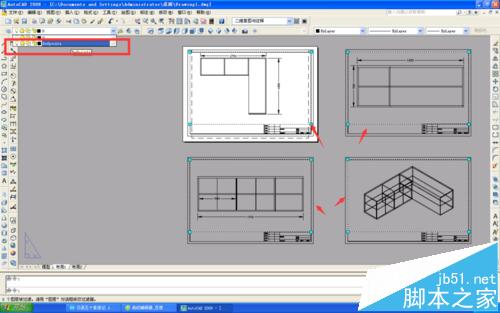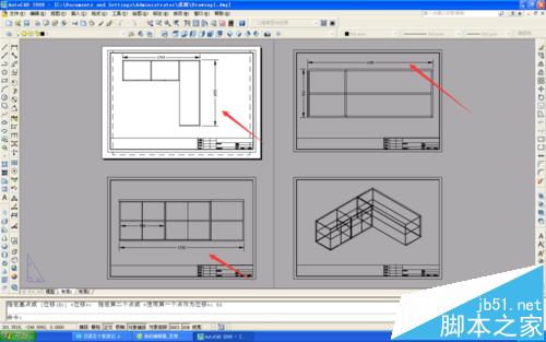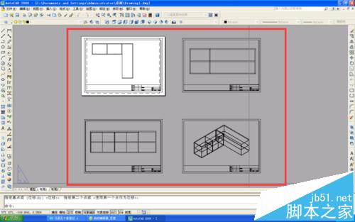 4、粘貼上我們圖紙格式之后,使用命令MV,創(chuàng)建一個新的視口。(為了讓你們看的更清楚,我粘貼了四個圖紙格式,分別用來呈現(xiàn)不同層面看到的物體狀態(tài)。)將所畫的東西一一標(biāo)注一下,如圖二所示。然后我們點(diǎn)擊打印或者直接按快捷鍵Ctrl+p,就會出現(xiàn)圖三的效果。選擇完打印機(jī)之后,在打印區(qū)域內(nèi)的打印范圍選擇窗口,然后將我們的圖紙格式框選住。