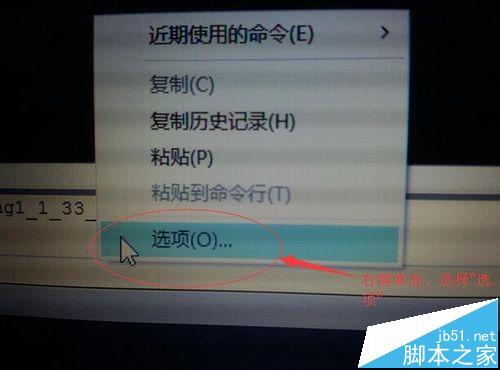 2、在命令行,單擊”右鍵“,選擇 ”選項“。
