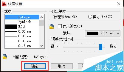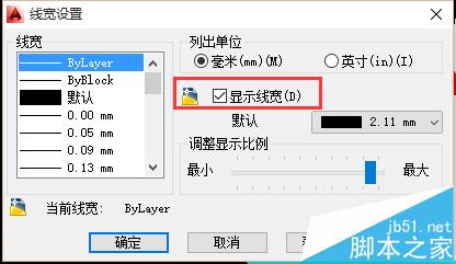 3、點擊【線寬】功能選項,彈出線寬設置對話窗口,通過該對話窗口可以發(fā)現勾選了顯示線寬的選項,這也是為什么圖像的線寬比較粗,圖像模糊的根本原因,如下圖所示。