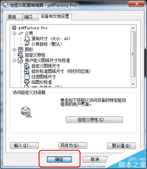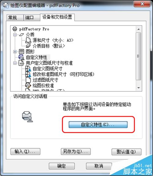 3、在“繪圖儀配置編輯器”對話框中單擊“自定義特性”。