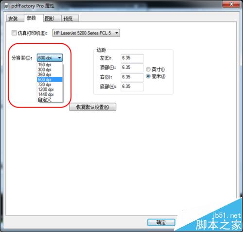4、在彈出的“pdfFactory Pro屬性”對話框中首先進入“參數”選項卡,將分辨率設置為600dpi(分辨率也可自行定義,分辨率越高打印質量越好,同時也意味著文件體積越大?。?。