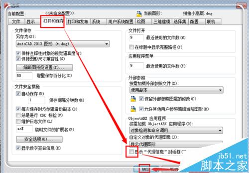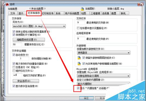 2、進(jìn)入選項(xiàng)對(duì)話框,然后點(diǎn)擊“打開和保存”,在其目錄下,將“顯示代理信息對(duì)話框”前面的勾去掉,然后點(diǎn)擊“應(yīng)用”,最后點(diǎn)擊“確定”,返回繪圖窗口,下次打開就不會(huì)顯示代理信息了。