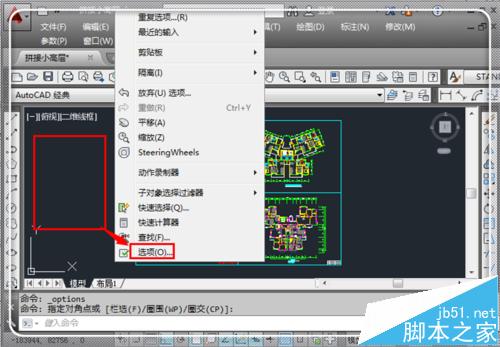 1、在CAD繪圖窗口空白處,點(diǎn)擊鼠標(biāo)右鍵,彈出快捷選項(xiàng),點(diǎn)擊“選項(xiàng)”。