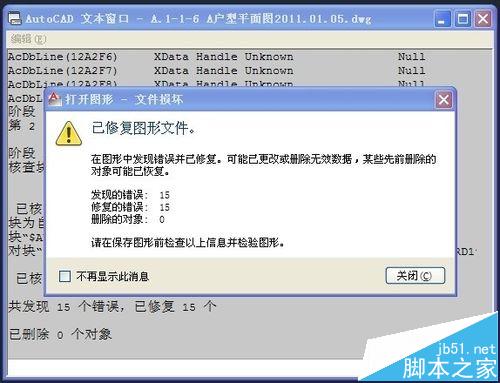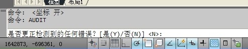 2、清理完成后,我們需要對圖形進行修復,如果此時你的圖還處于打開狀態(tài),那么你輸入核查命令audit,會出現(xiàn)以下下對話框。