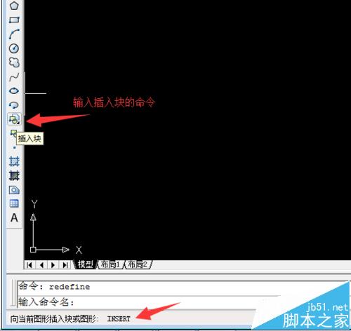 4、這時(shí)我們?cè)佥斎?ldquo;插入塊”的命令就行了,但是我們不知道“插入塊”的命令是什么。在“插入塊”工具鼠標(biāo)懸停幾秒,在狀態(tài)欄就顯示命令的名稱了“insert”。