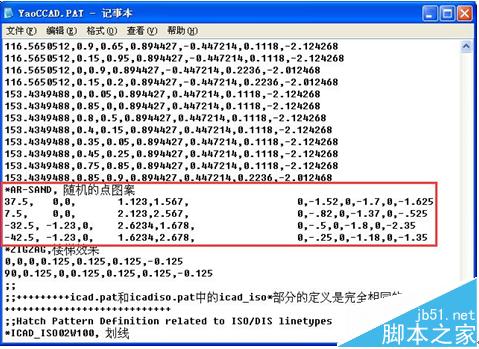 1、從AutoCAD中找到圖案填充的定義文件,如XP系統(tǒng)中的acad2008的定義文件:C:/Documents and Settings/Administrator/Application Data/Autodesk/AutoCAD 2008/R17.1/chs/Support/acad.pat,從這個(gè)文件中找到所要剖面圖案的定義,如下圖是隨機(jī)的點(diǎn)圖案的定義: