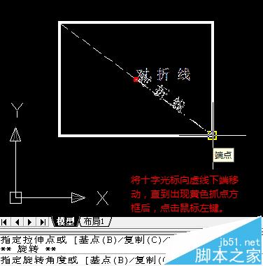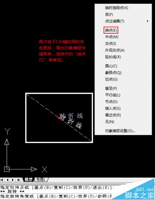 8、再次按住Ctrl鍵的同時(shí),點(diǎn)擊鼠標(biāo)右鍵,調(diào)出對(duì)象捕捉快捷菜單。這次,選該菜單中的“端點(diǎn)(E)”菜單項(xiàng)。然后,移動(dòng)十字光標(biāo)靠近虛線下端,直到出現(xiàn)黃色方框所示的對(duì)象捕捉標(biāo)志時(shí),點(diǎn)鼠標(biāo)左鍵。至此,文字已經(jīng)與斜線方向一致,且仍處于選中狀態(tài)。