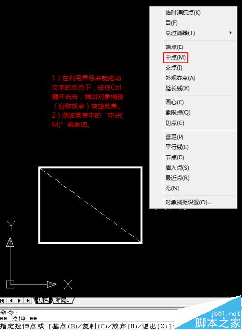 5、為能精確地保證文字與斜虛線方向一致,需要將文字移動(dòng)到虛線中點(diǎn)。因此,按住Ctrl鍵的同時(shí),點(diǎn)擊鼠標(biāo)右鍵,調(diào)出對(duì)象捕捉快捷菜單,選其中的“中點(diǎn)(M)”菜單項(xiàng)。