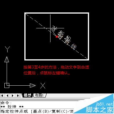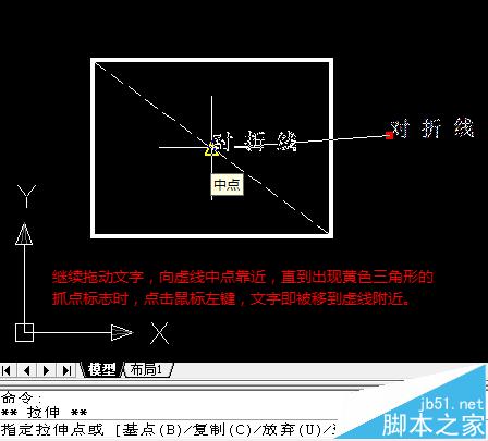6、繼續(xù)拖動(dòng)十字光標(biāo)(文字也隨著移動(dòng))靠近虛線中點(diǎn),直到出現(xiàn)黃色三角形的對(duì)象捕捉標(biāo)志時(shí),點(diǎn)擊鼠標(biāo)左鍵。這時(shí),文字就被移動(dòng)到了虛線旁,且仍處于選中狀態(tài)。