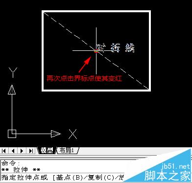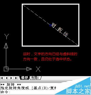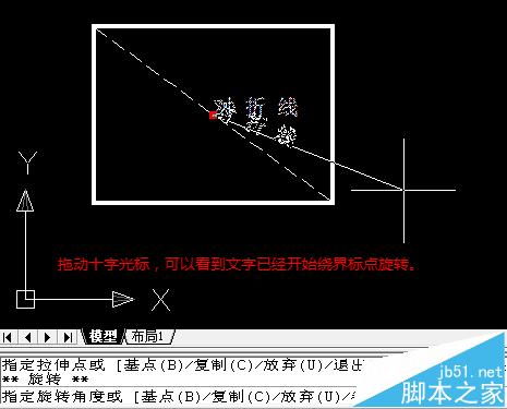 7、再次鼠標(biāo)左鍵點(diǎn)擊界標(biāo)點(diǎn),使其變紅。緊接著再點(diǎn)鼠標(biāo)右鍵,調(diào)出界標(biāo)點(diǎn)快捷命令菜單,選中其中的“旋轉(zhuǎn)(R)”菜單項(xiàng)。拖動(dòng)十字光標(biāo),可以發(fā)現(xiàn)文字已經(jīng)開(kāi)始繞界標(biāo)點(diǎn)(也就是虛線中點(diǎn))旋轉(zhuǎn)了。