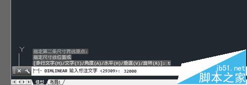 5、然后在命令行中輸入T,按確定后,可以在命令行看到輸入標(biāo)注文字的字樣,比如要將真實(shí)尺寸29300改為32000,在命令行中輸入32000;