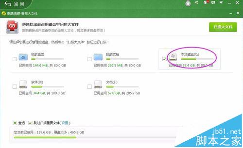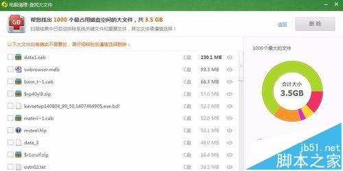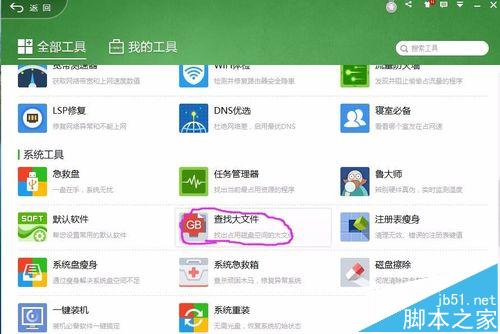 3、在這些文件夾中的某個運行的文件有問題。但是你直接找是找不到的,這個文件是看不到的。我們就要借助查找大文件的工具,這里使用的是360衛士自帶的查找大文件功能為例介紹。具體操作的步驟請看下面的圖片示例