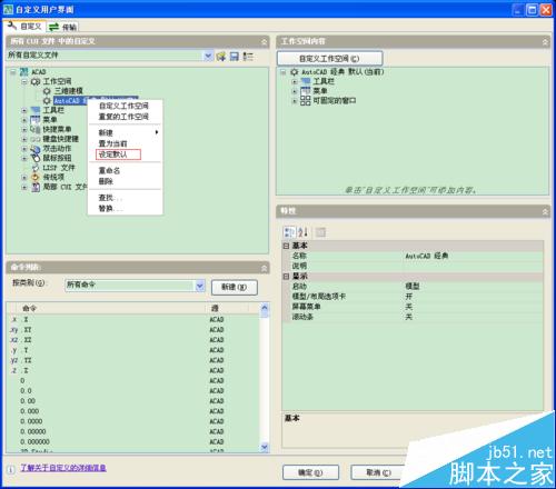 2、首先輸入命令:【CUI 】之后在--自定義--工作空間--右鍵點擊“AutoCAD經典”選擇設定默認。