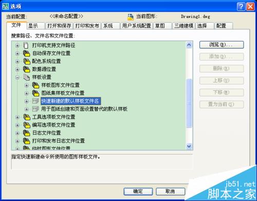 5、接著 樣板設置”---“快速新建的默認樣板文件名”瀏覽指定到“acadiso.dwt”