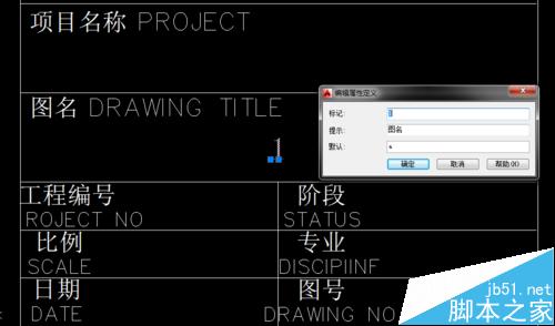 4、上圖中“1”和“2”是兩次att命令后的結果。下面要進行的步驟是,把圖框和“1”“2”都選中,定義成塊(塊命令為“b”),定義成塊后會出現如下對話框,在這個對話框中,左側是“提示”項中的內容,右側輸入框中的內容為“默認”項中的內容(現在可更改,可不更改,這里先不更改),然后確定或關閉此對話框。