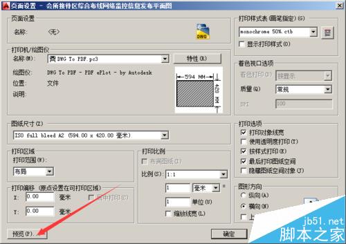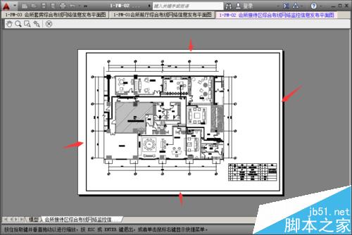 6、在彈出的打印預覽界面中查看所設置的圖框是否超出打印機或繪圖儀的打印范圍,如下圖的四個箭頭標識區域,可以看到圖框均沒有超出打印范圍。
