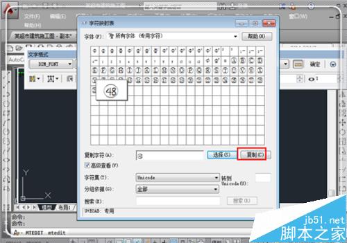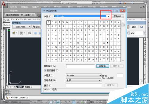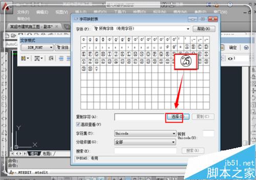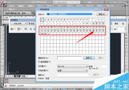 5、這時候要求選擇代碼,這里選擇一個代碼,可以看見,這里已經有不少的特殊符號了,比如鋼筋型號等,為了避免誤操作導致cad異常,需要選擇空白處的代碼,如這里點擊左下角的一個方框,然后點擊“確定”。