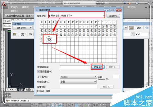 11、這時候我們進入多行文版編輯,然后進入到這個映射表,點擊“字體”后面倒三角形,找到“所有字體(專用字符)”,點擊它,這時候就出現了剛才我們編輯的帶圈的48;點擊這個剛才編輯的帶圈的48,然后點擊“選擇”。