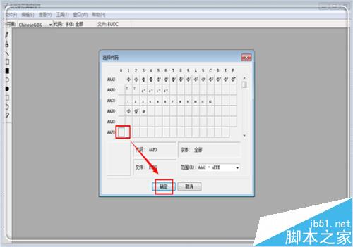 10、這時候進入特殊字符編碼界面,找到一個空白的地方點擊,如這里的右下角,選擇符號放置的位置,然后點擊“確定”。