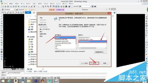 5、在打開的“添加繪圖儀——繪圖儀型號“頁面,生產商選擇Adobe,型號選擇PostScript Level2,再單機【下一步】按鈕。