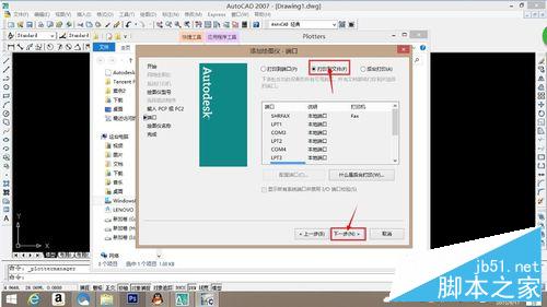 7、在“添加繪圖儀——端口“頁面中,選擇”打印到文件“,再單機【下一步】按鈕。