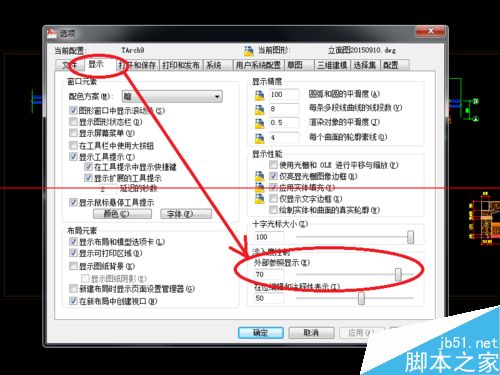 4、點擊“選項”,彈出一個“選項”對話框,該對話框的左上角有個“當前配置”字樣,在其下方有一排按鈕,切換到“顯示”按鈕,在右邊一欄找到“外部參照顯示字樣”,下面有一個數值和一根拉條,如圖所示: