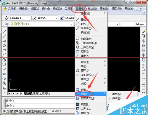 2、在上方菜單欄中選擇繪圖功能,彈出的二級(jí)菜單選項(xiàng)中選擇點(diǎn),在點(diǎn)的下一級(jí)菜單中選擇“定距等分”選項(xiàng)。