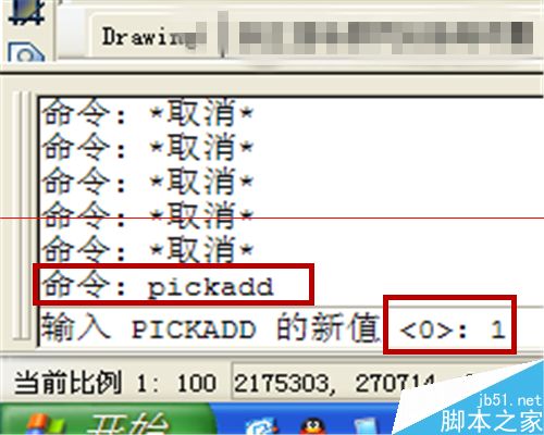 6、還有一個快捷命令的方法,在命令行輸入“pickadd”,再輸入“1”,代替原來的“0”,回車,就好了,現在就能多選了。